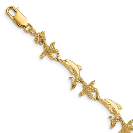 14K Polished and Textured Dolphin and Starfish 7.5 inch Bracelet