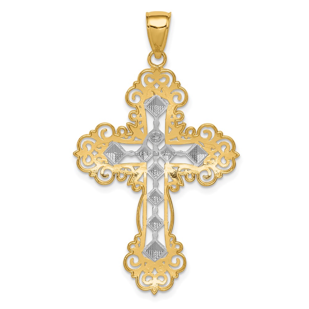 14K and White Rhodium Polished Textured Diamond-Pattern Cross Pendant