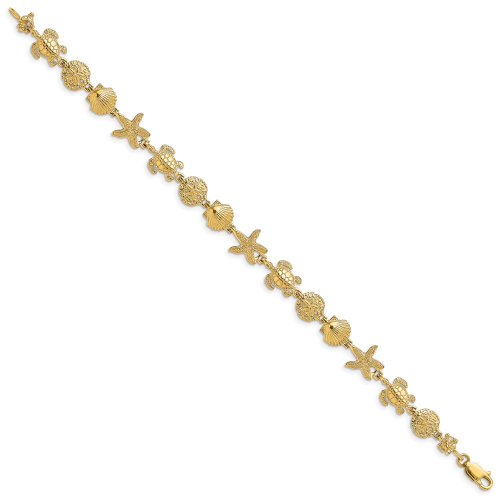 14K Polished Turtle/Sand Dollar/Shell/Starfish Link 7 inch Bracelet