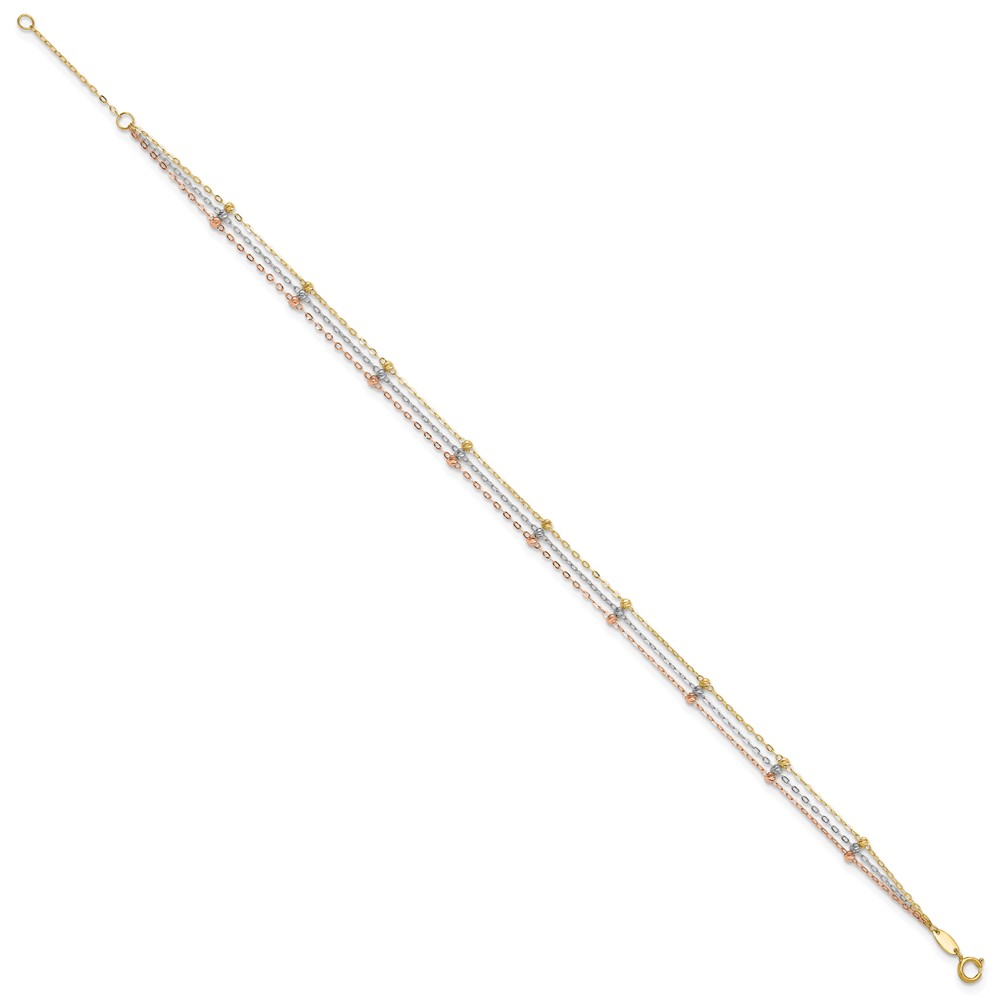 14k Tri-color 3-Strand Diamond-cut Beaded 9-Station Plus Extender – Total Anklet