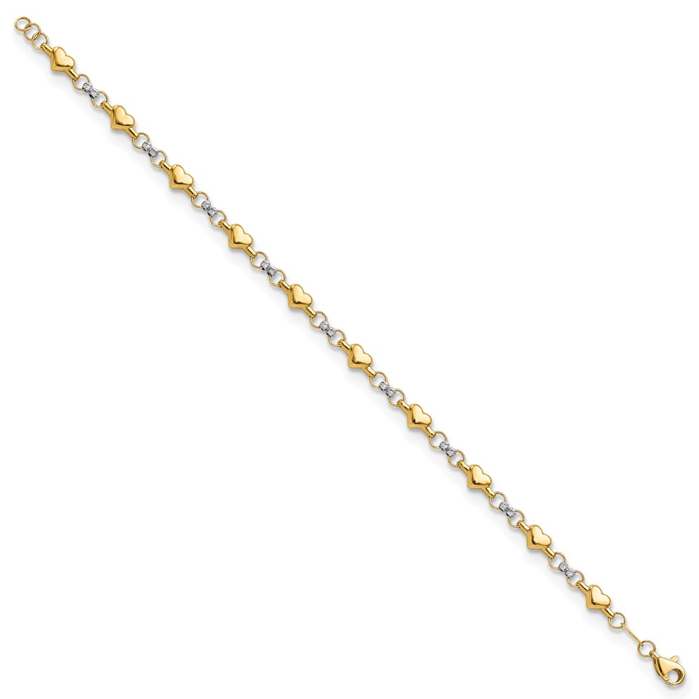 14K Two-tone Polished Puffed Hearts with Diamond-cut Beads 7.5 inch Bracelet