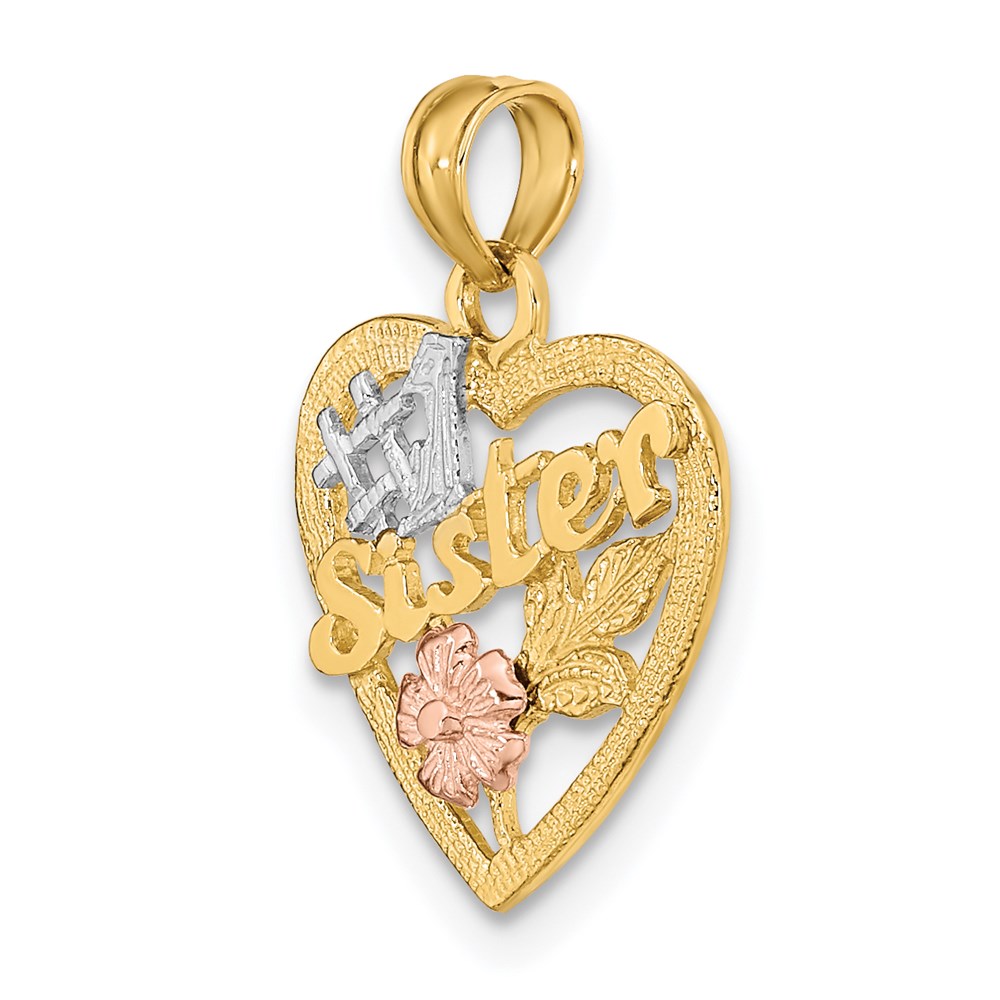 14k Two-tone with White Rhodium #1 SISTER In Heart with Flowers Charm