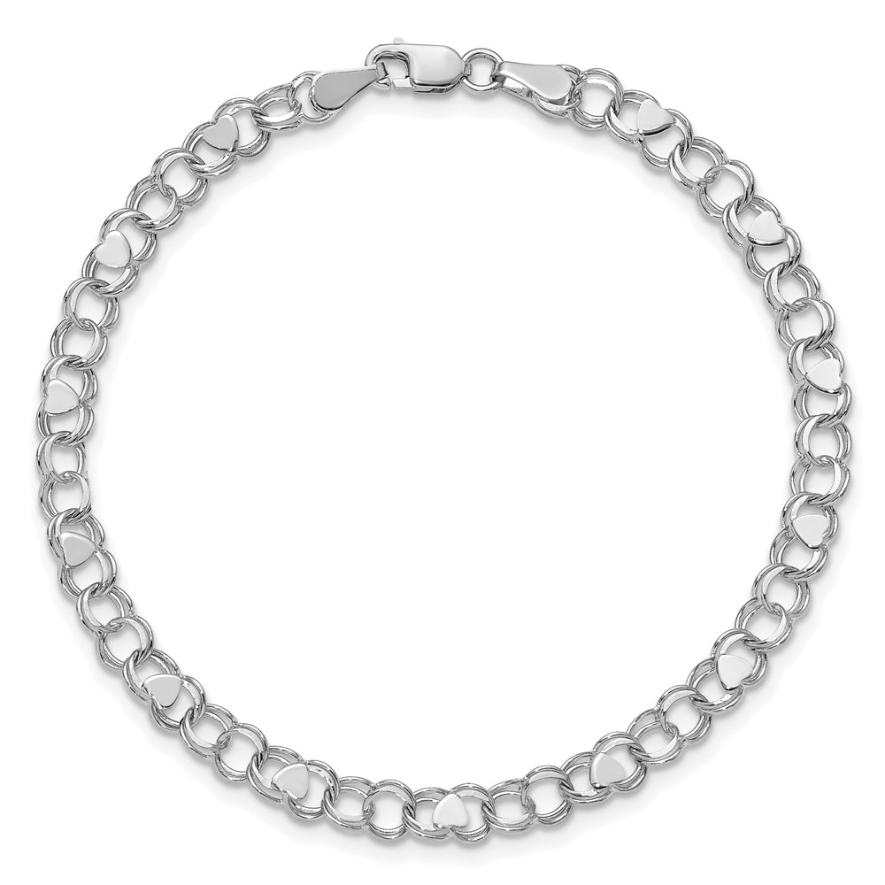 14k White Gold 4mm Solid Double Link with Hearts Charm Bracelet