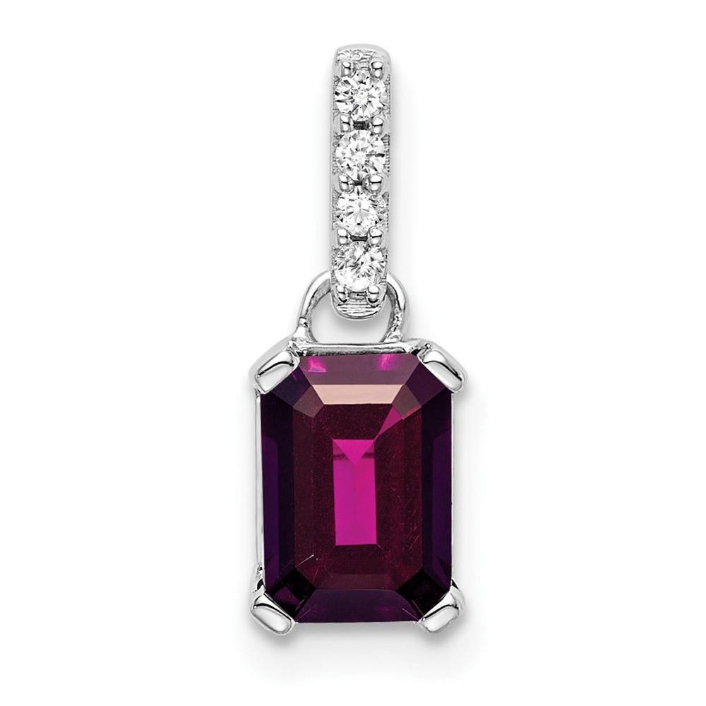 14k White Gold 7×5 Emerald-cut June/Rhodolite Garnet and Diamond Pendant