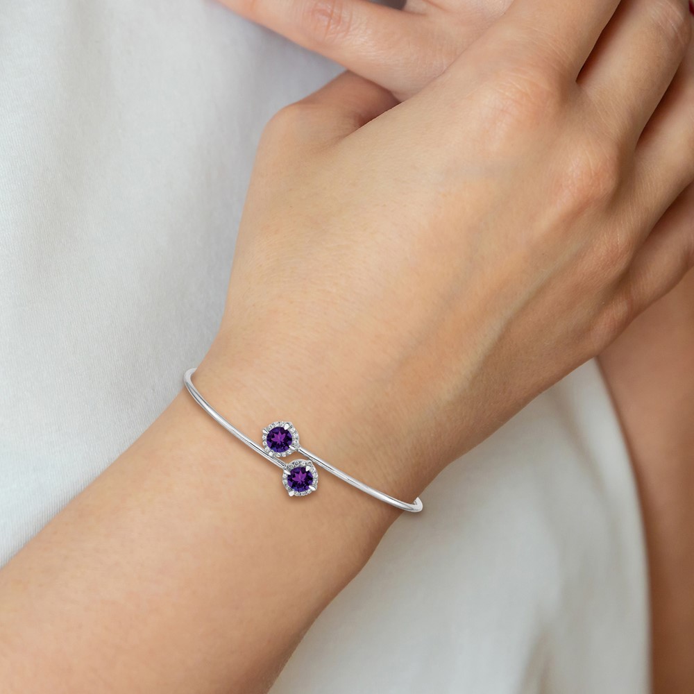 14k White Gold Complete Round Amethyst and 1/8 carat Diamond Halo Flexible Bangle Bracelet