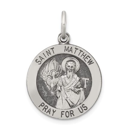 14k White Gold Polished and Satin Hollow St Matthew Medal Round Pendant