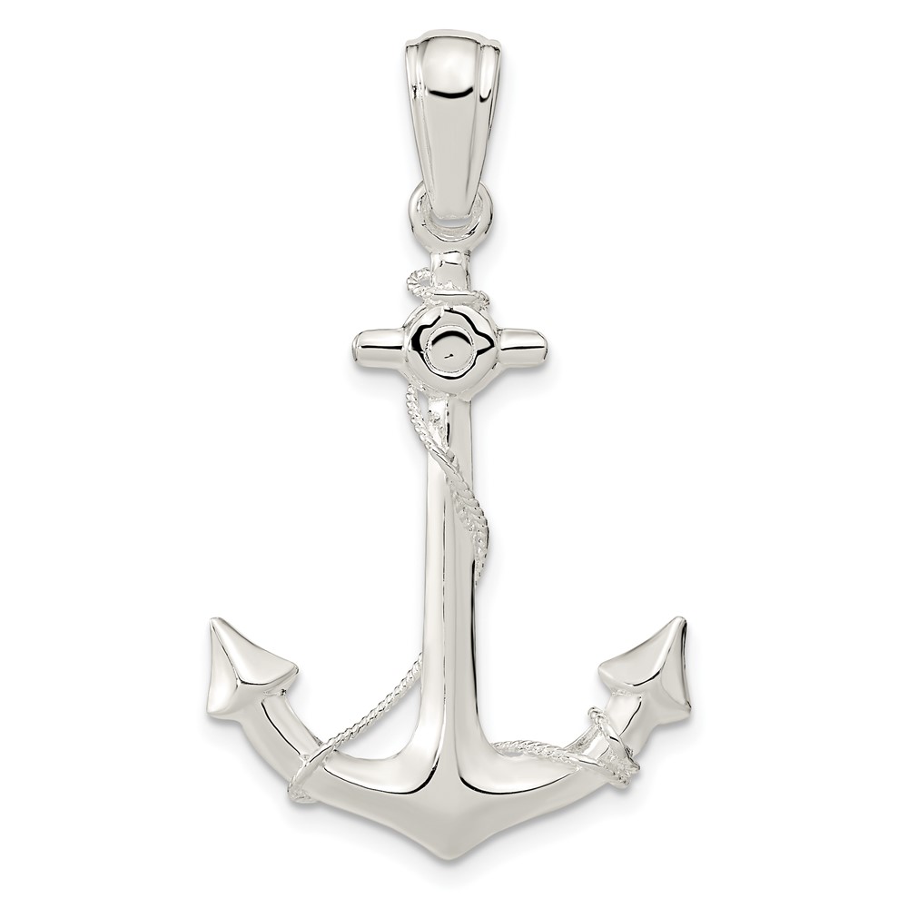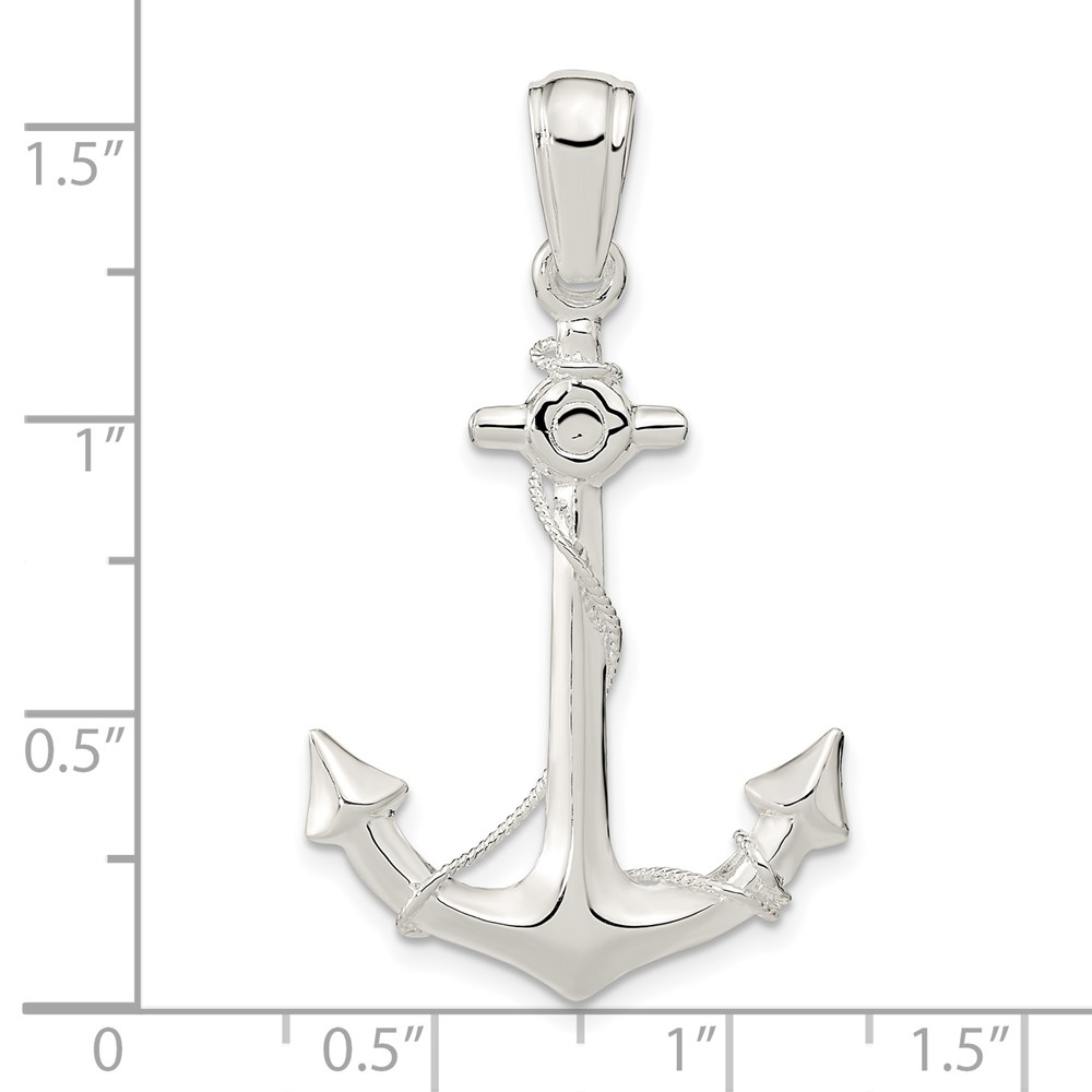 De-Ani Sterling Silver Rhodium-Plated Polished 3D Anchor with Rope Pendant