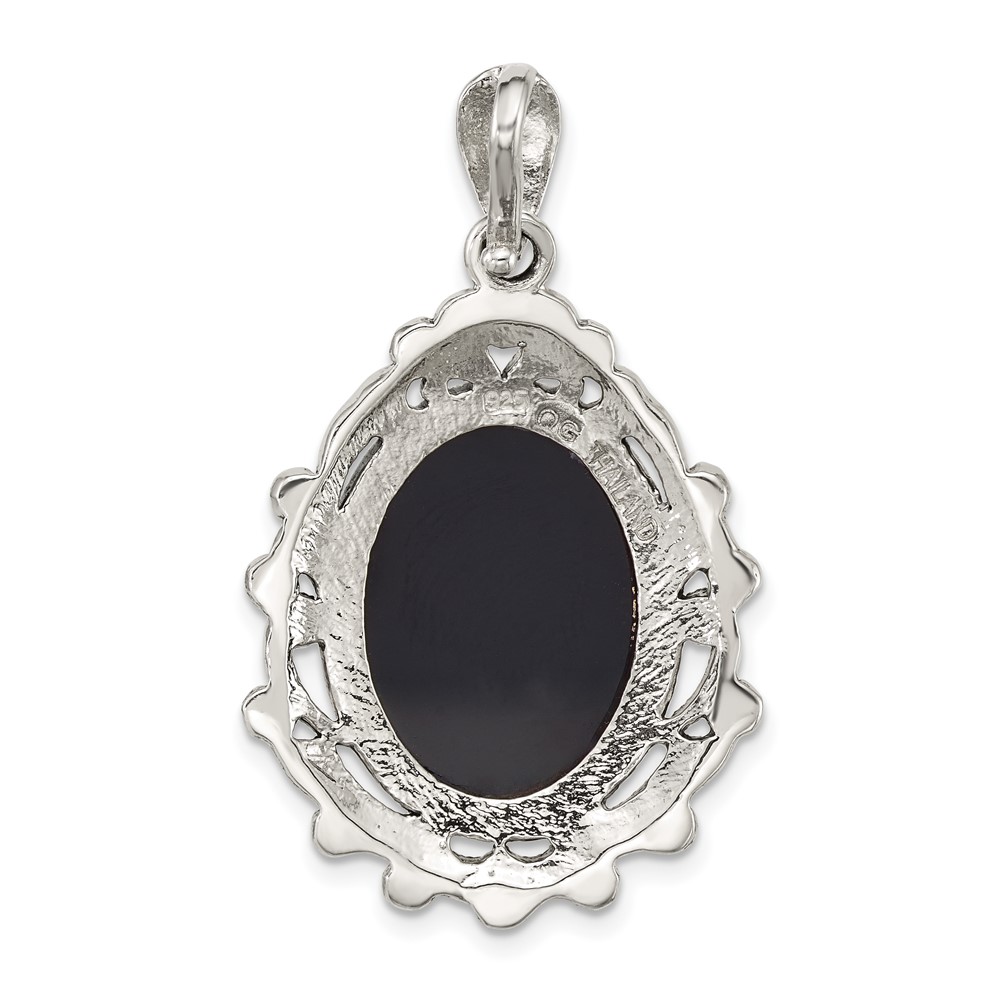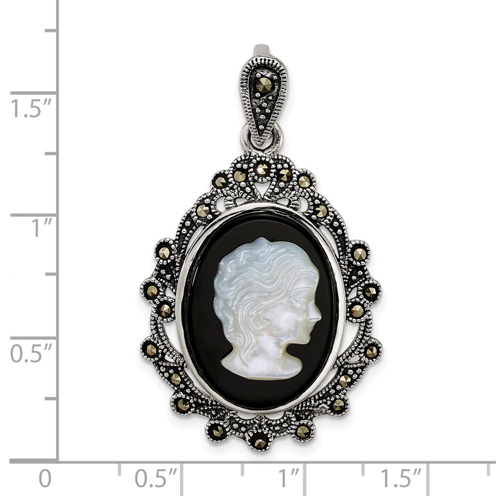 Sterling Silver Antiqued Marcasite with Black Agate and Mother of Pearl Cameo Pendant