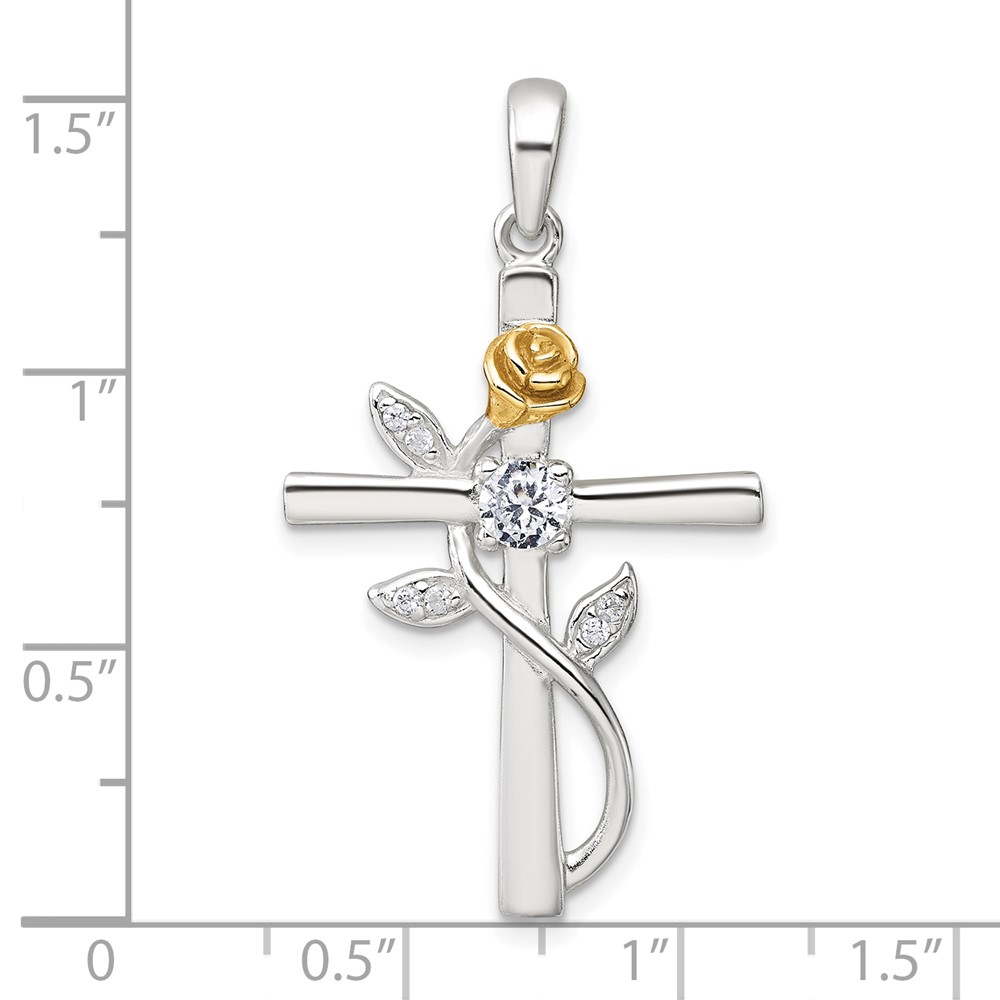 Sterling Silver E-Coat Polished Cross with CZ and Gold-tone Rose Pendant