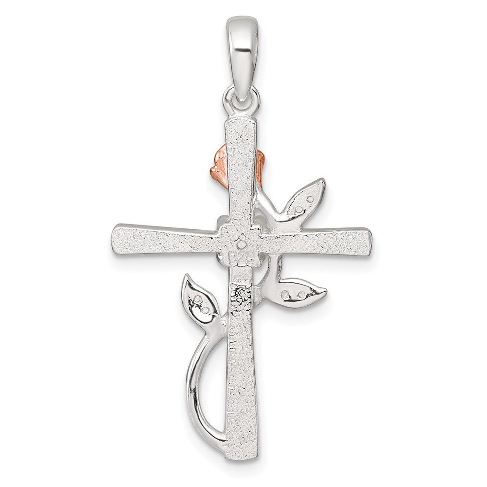 Sterling Silver E-Coat Polished Cross with CZ and Rose-tone Rose Pendant