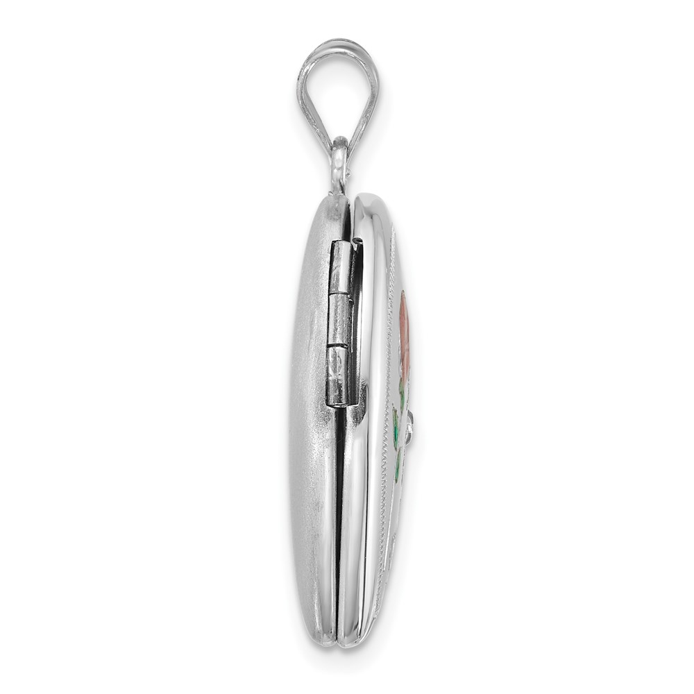 Sterling Silver Rhodium-plated Brushed 1/20 carat Diamond Pink and Green Enameled Rose LOVE YOU MOM 24mm Heart Locket