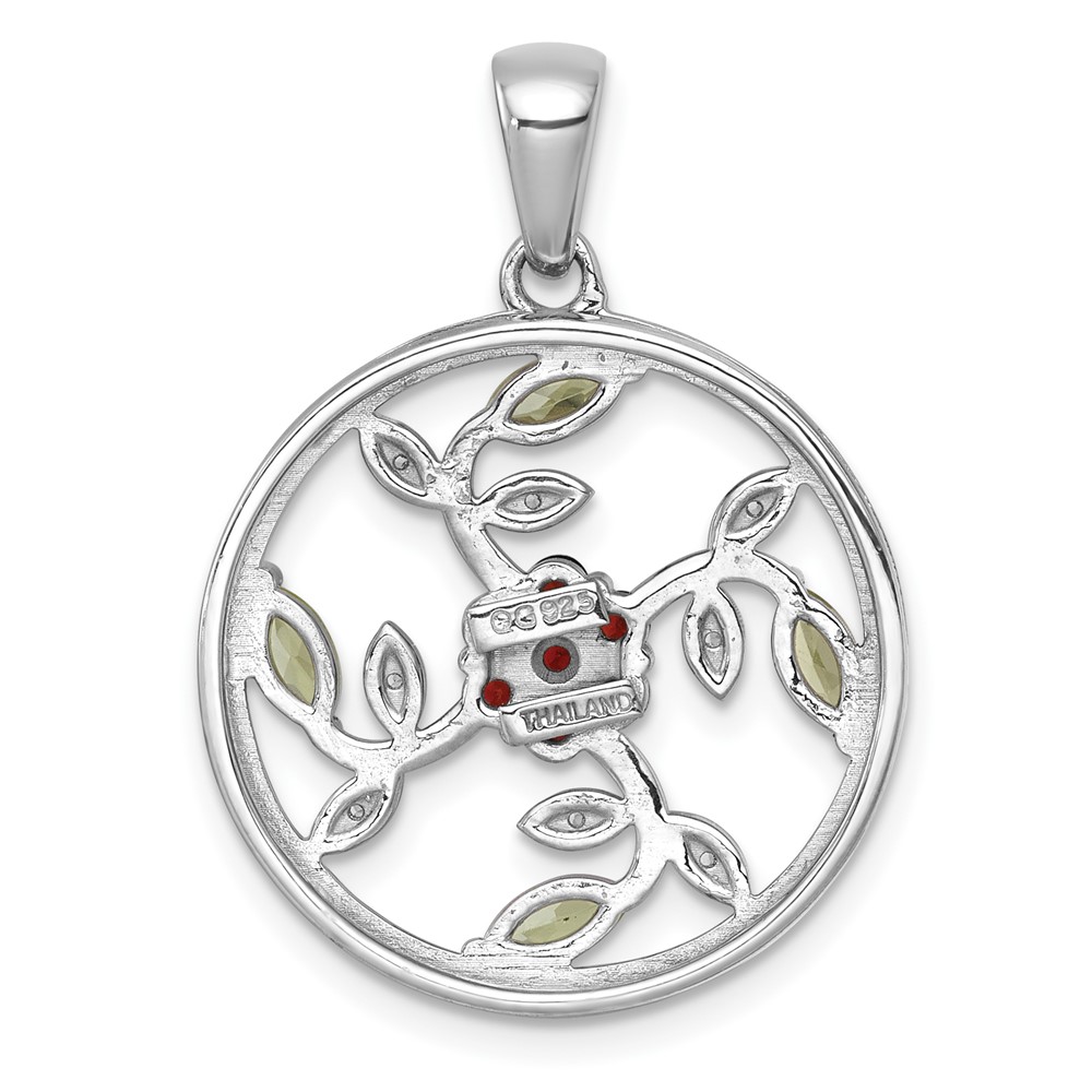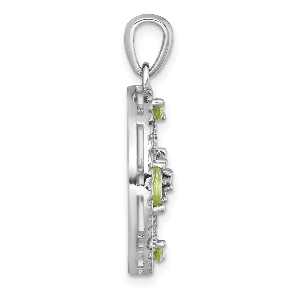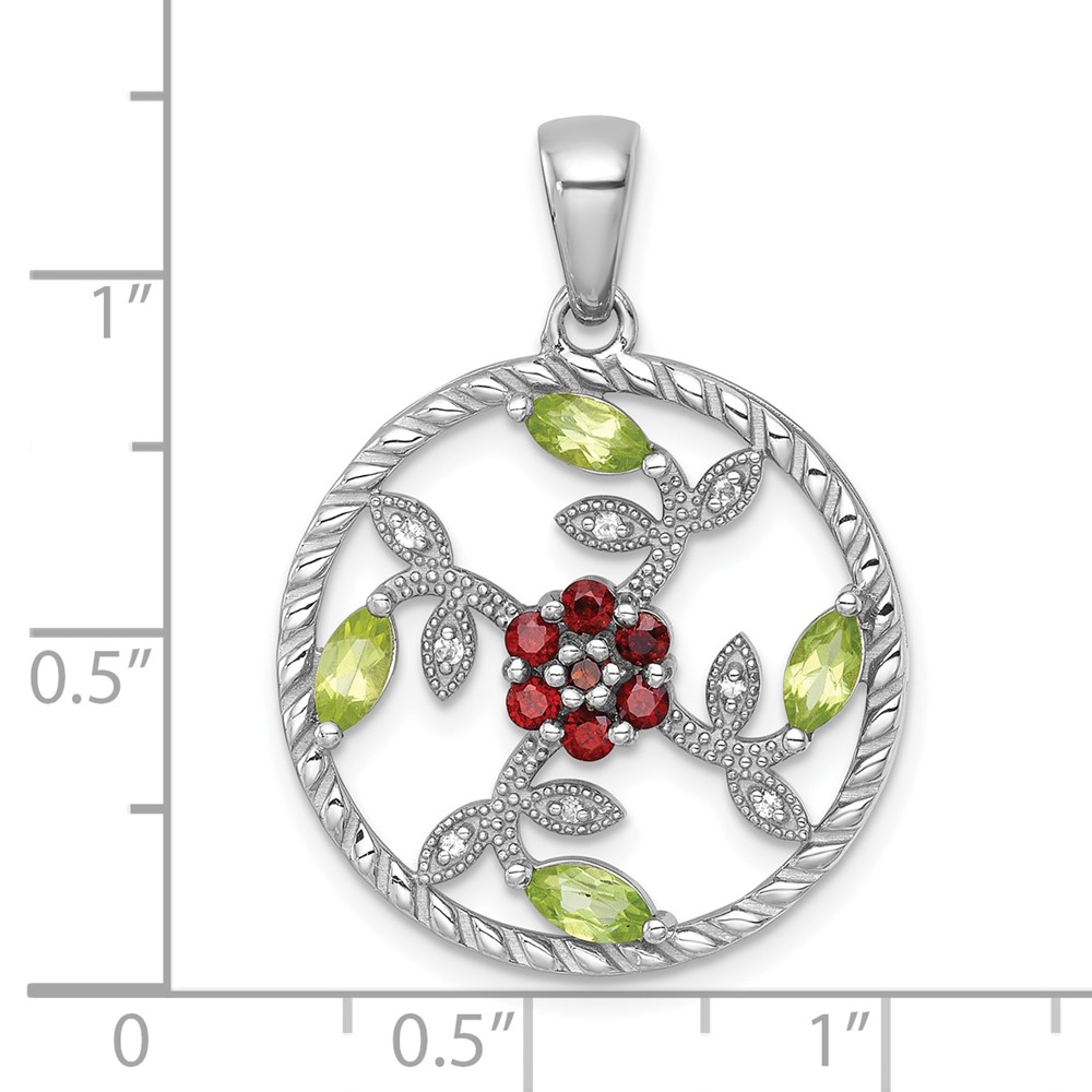 Sterling Silver Rhodium-plated Polished Garnet, Peridot and White Topaz Floral Twisted Circle Pendant